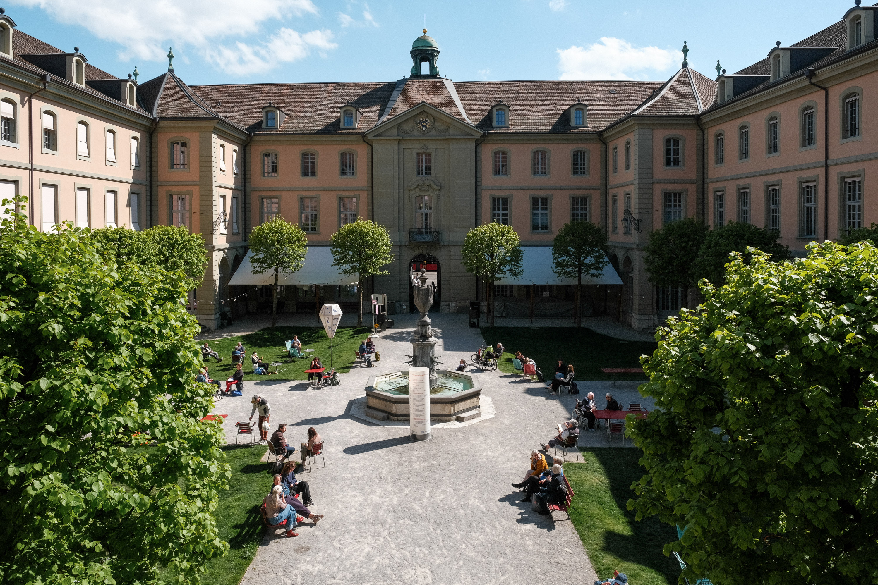Eine Gruppe Menschen steht beim Brunnen im Innenhof des Berner Generationenhaus und lauscht den Ausführungen einer Dialogerin.