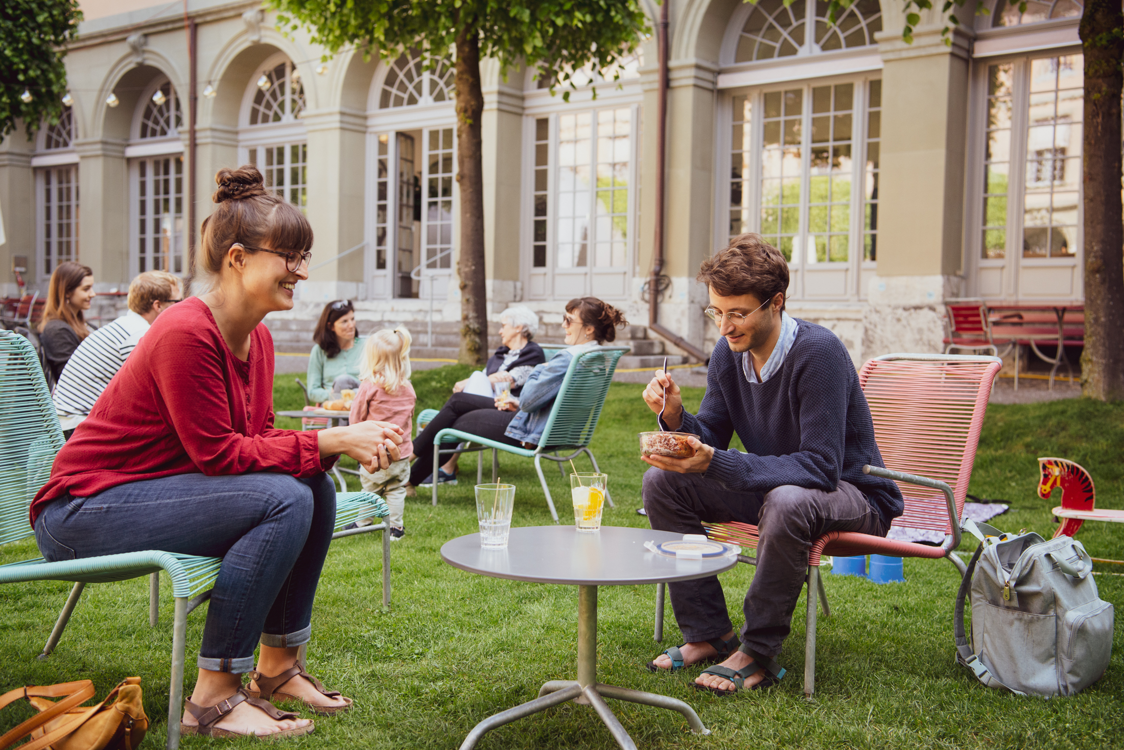 Der Innenhof ist offen für alle und mit seiner zentralen Lage neben dem Bahnhof Bern ein wunderbarer Ort, um der Hitze und Hektik des Alltags zu entfliehen.